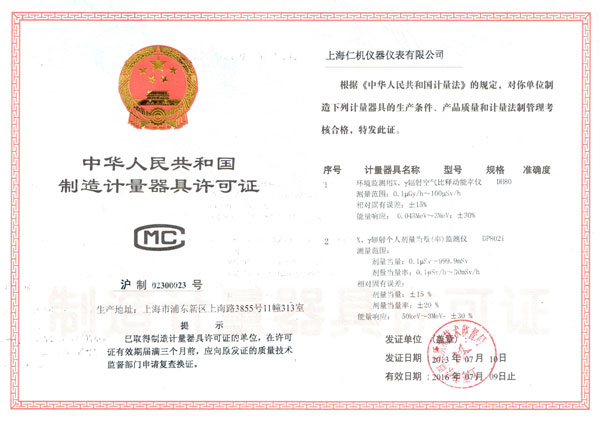| 持证单位: 上海仁机仪器仪表有限公司 |